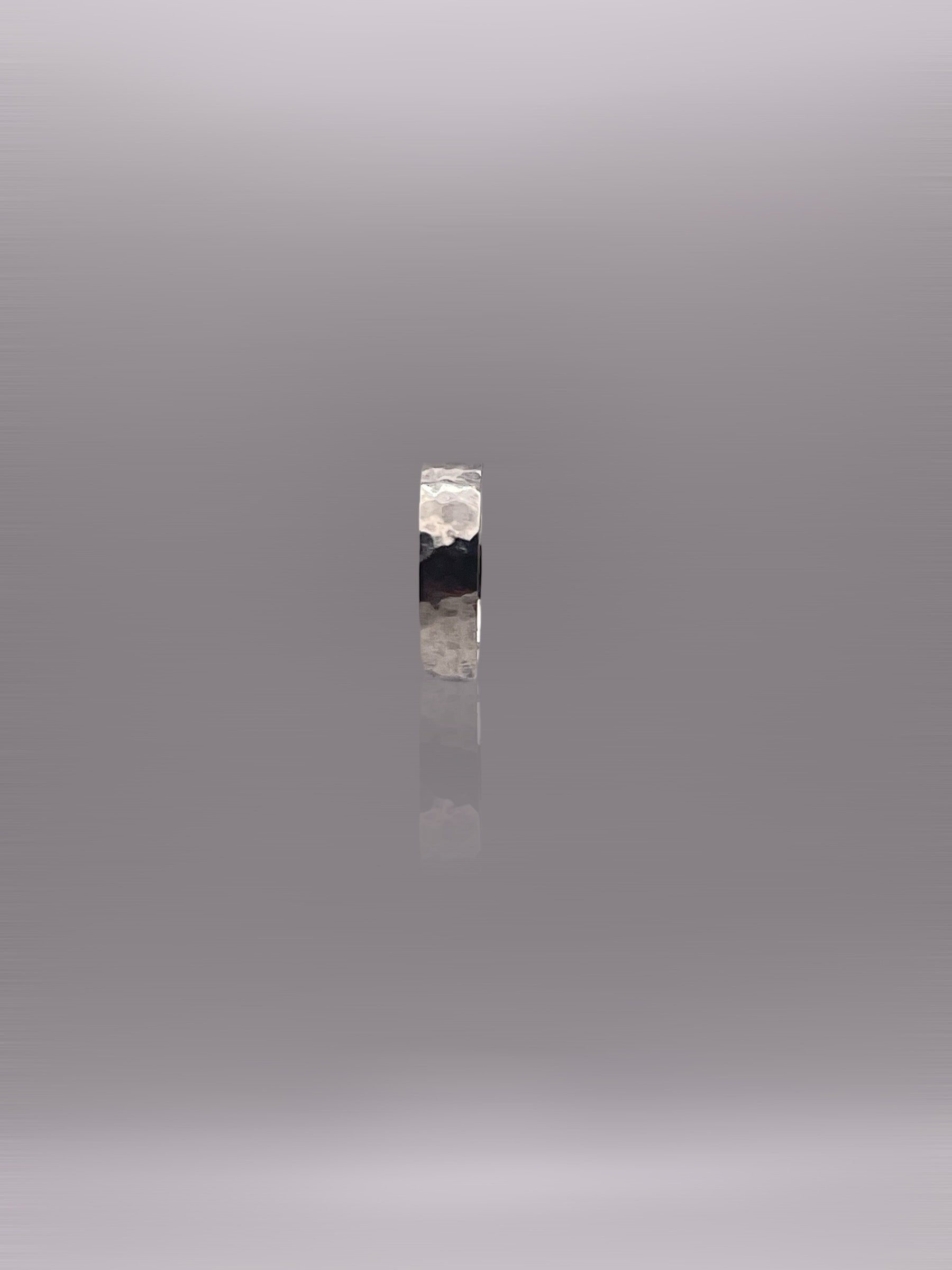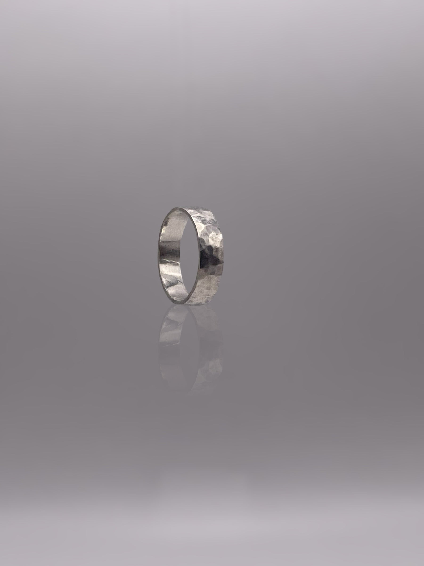 This silver ring features a hand-hammered texture that catches the light with every angle. Its simple, sturdy design highlights the beauty of handmade work and natural surface detail.