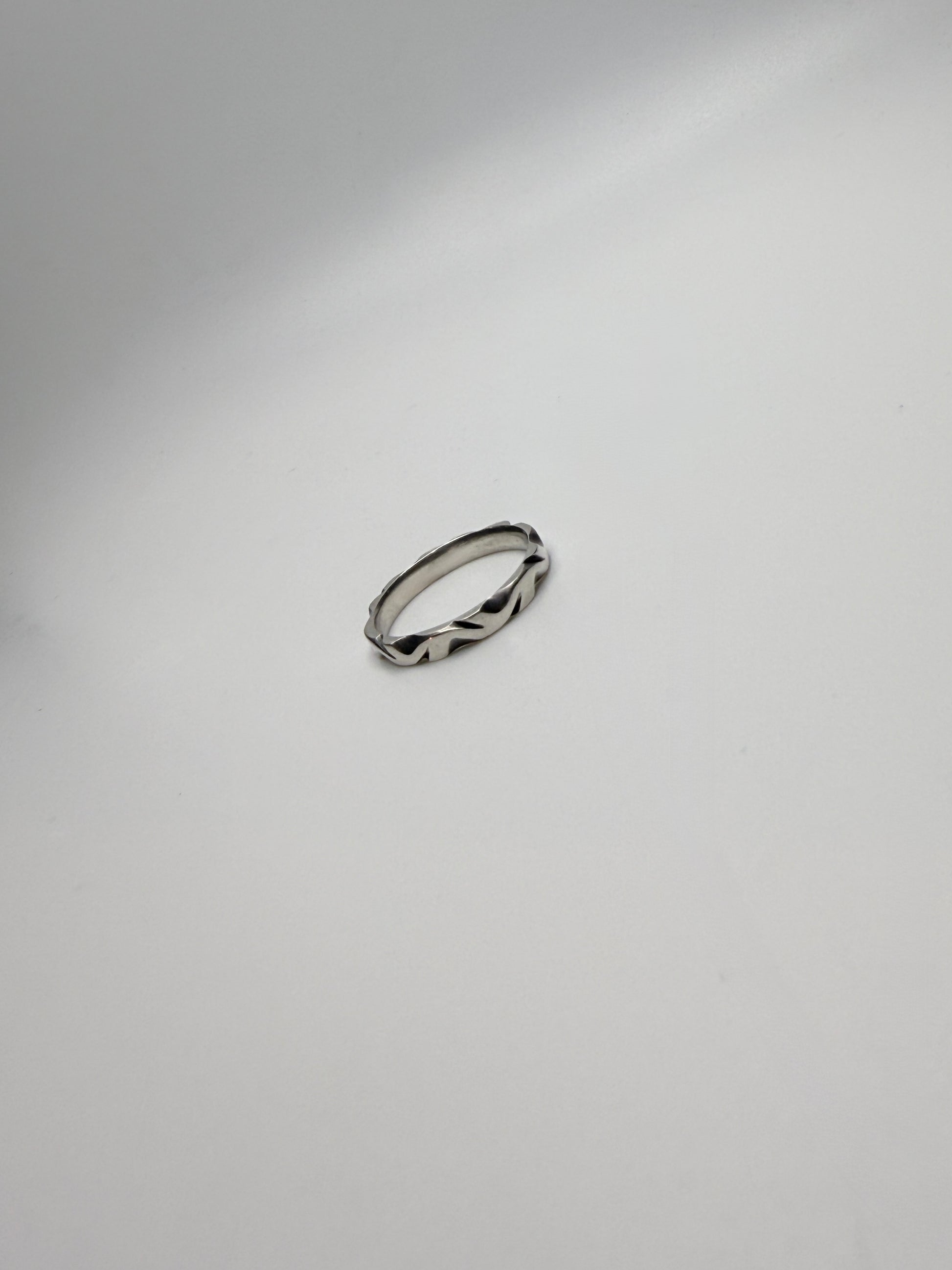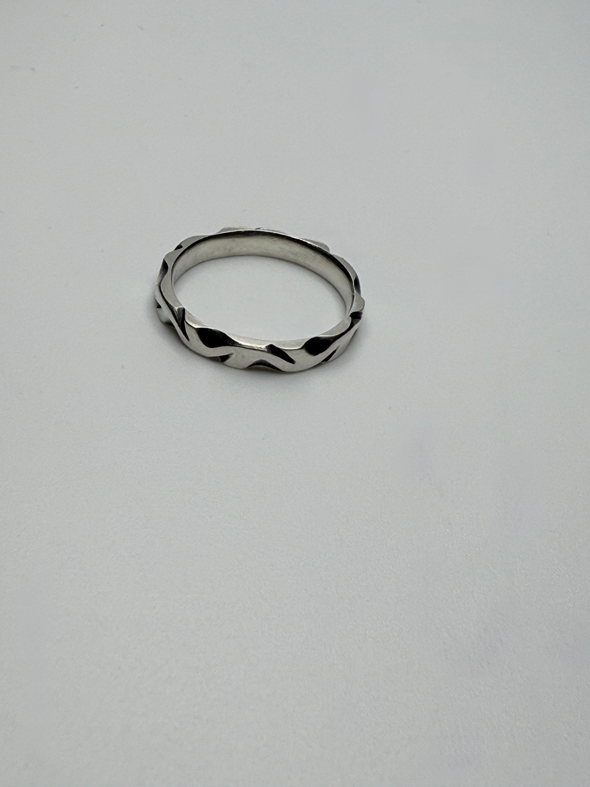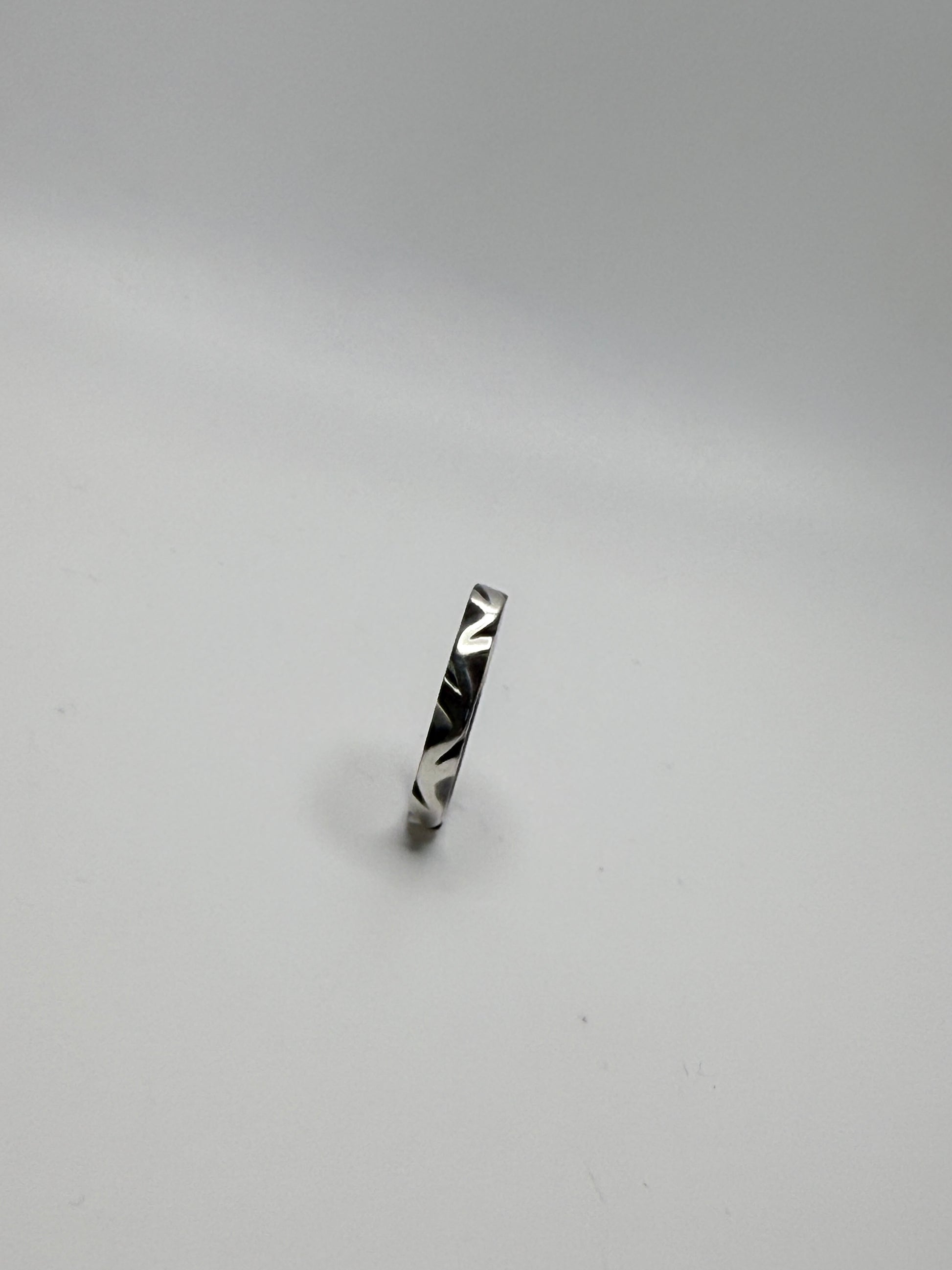 A solid sterling silver band with a sculpted, organic surface. Simple, durable, and made by hand