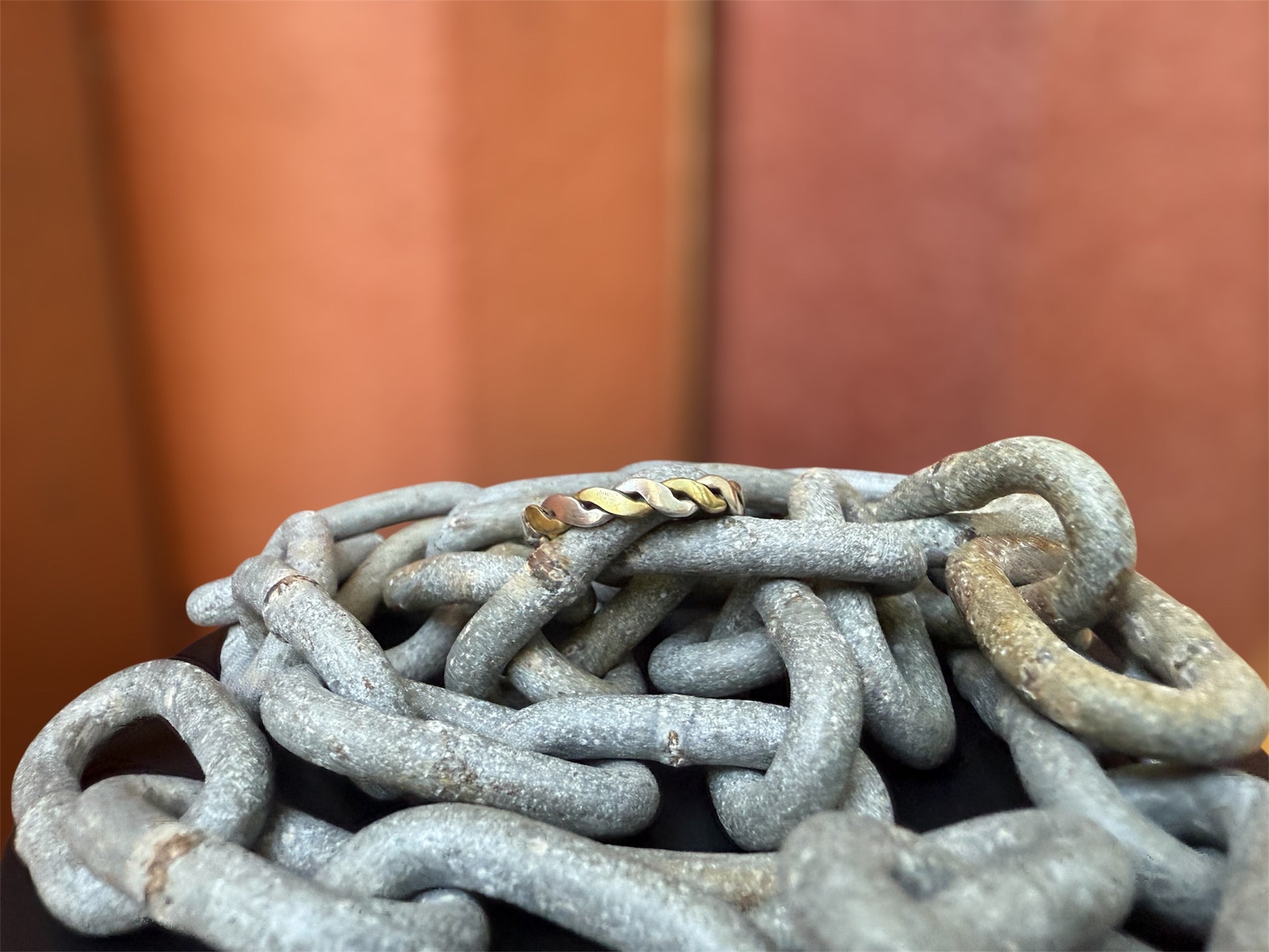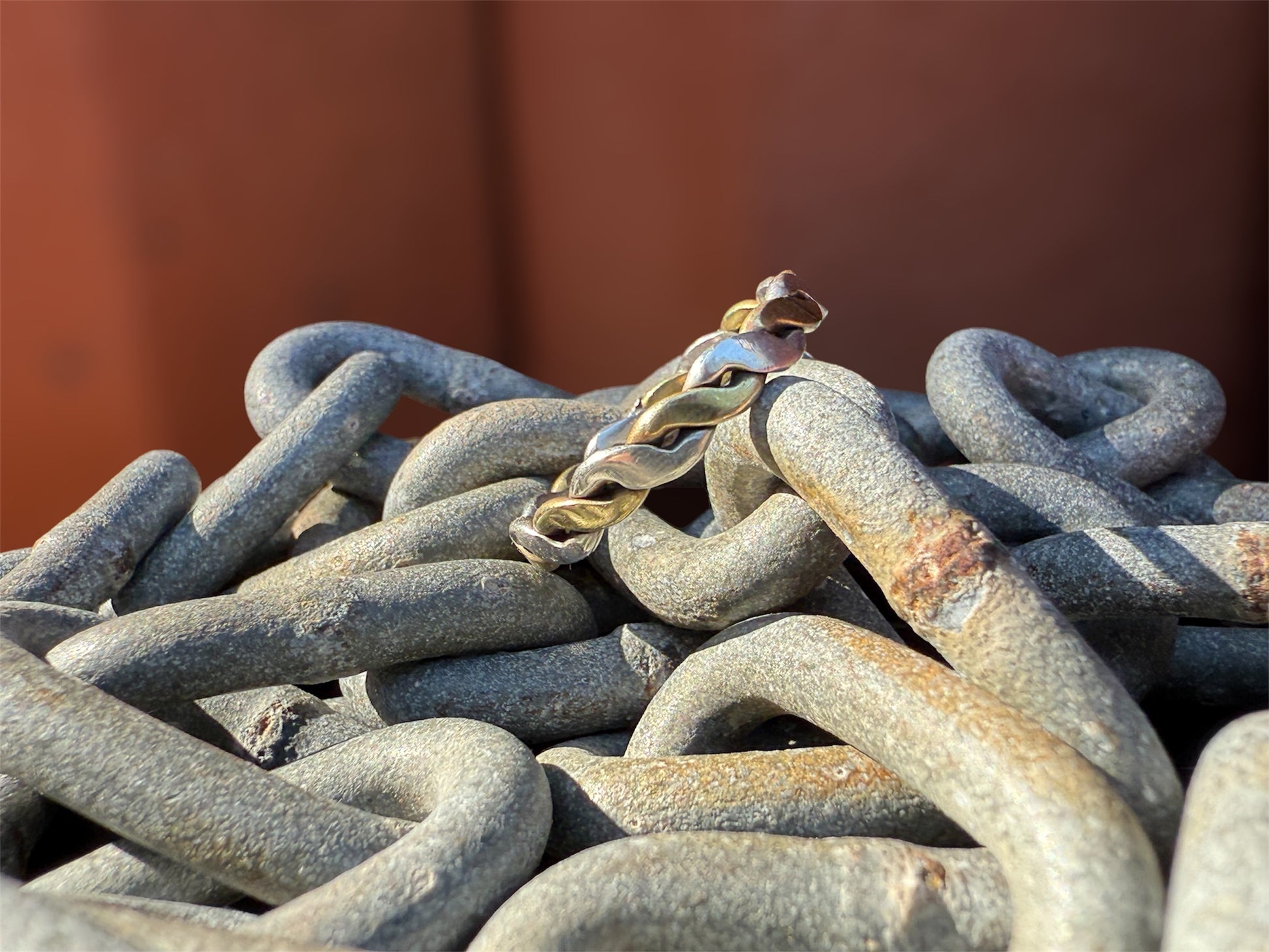 A handmade sterling silver ring with a smooth, twisted design inspired by chain links. Its polished surface catches the light, making it perfect to wear on its own or stacked with other rings.